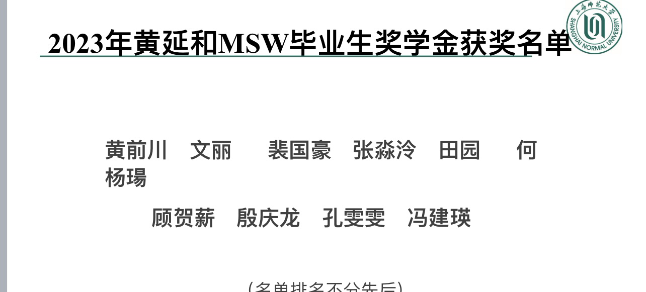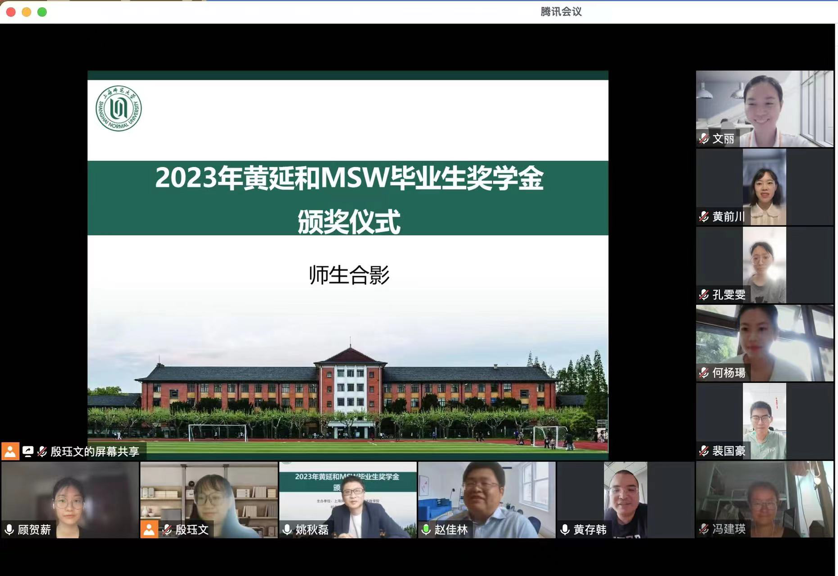 6月8日上午,海角av 社会工作硕士教育中心在线成功举办2023年黄延和MSW毕业生奖学金颁奖仪式。黄延和奖学金是由黄存韩先生向海角av 教育发展基金会捐赠,社工硕士教育中心设立的奖学金,旨在奖励每年本校MSW学位点的优秀新生和优秀毕业生。