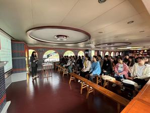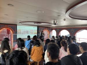 甲板上,同学们伴随着江风涛声直观地感受中国式现代化在上海黄浦江两岸的生动案例,结合传统城市“上海城”、近代城市“外滩”、现代城市“陆家嘴”、人民城市“世界会客厅”等地标建筑,在中国式现代化上海实践中深刻领悟“人民城市”理念,深入理解把握中国式现代化理论,亲身感受了上海这座社会主义现代化国际大都市所散发的魅力和活力,在中华民族从站起来、富起来、强起来到走进新时代的百年大党奋斗历程中收获新体验。