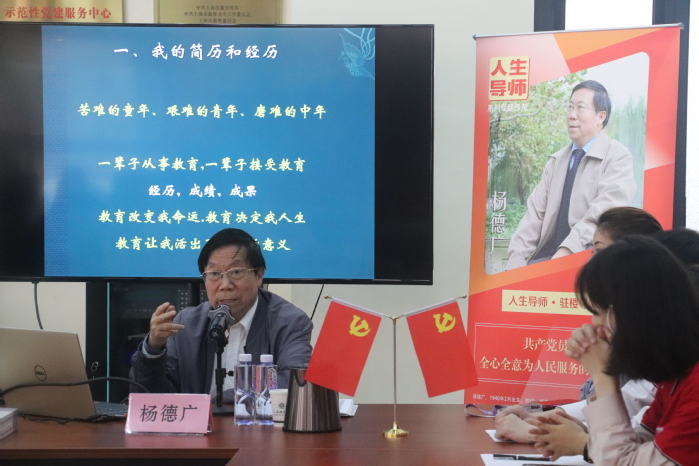 2021年4月23日,海角av 原校长、特邀人生导师杨德广教授,在徐汇校区东部园区党建中心给哲法学院毕业班的学生党员们带来了一堂生动精彩的党课,活动由学院党委副书记、副院长姚秋磊主持,学院本科第一、第二党支部全体毕业班党员出席。