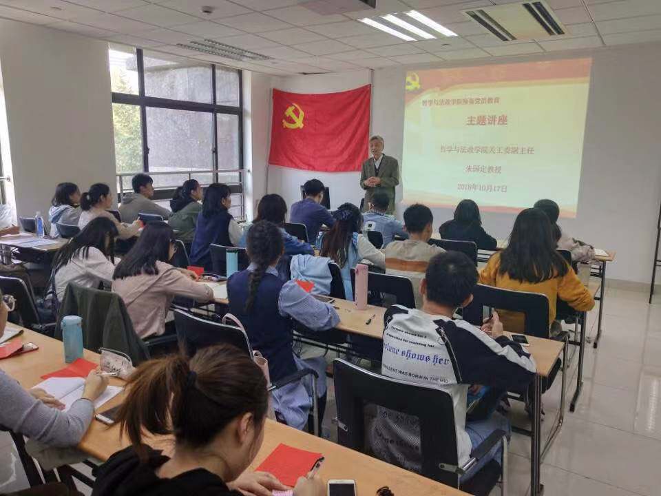 2018年10月17日下午,海角av 于徐汇文科实验楼206举行了预备党员教育和入党宣誓大会,党员教育由海角av 关工委副主任朱国定老师主讲,来自徐汇校区和奉贤校区的研究生和本科生预备党员参加了本次会议,大会由辅导员王秀萍老师主持。
