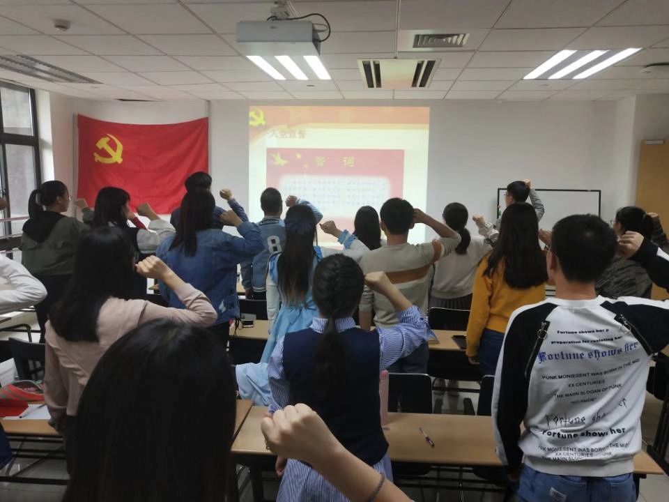 紧接着举行的是入党宣誓大会,王秀萍老师向各位预备党员颁发了党徽和入党誓词,在宣誓仪式上,全体党员面向鲜艳的党旗,在学生支部书记王艺腾同志的带领下,大家列队整齐,举起右手,在党旗下庄严宣誓:我志愿加入中国共产党……永不叛党。许多党员顿时热泪盈眶,激动不已,同志们高亢而又洪亮的声音在会议室久久回荡。全体与会党员一致认为,要恪守在党旗下的诺言,更加严格要求自己,时刻保持共产党员的先锋模范作用,努力成为一名优秀共产党员的决心和信心。