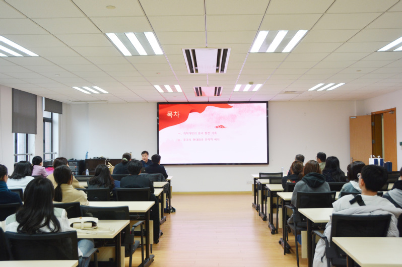 在“改革开放的中国发展纪实”这一部分中,刘林院长首先介绍了改革开放的五个阶段,其次就正确看待改革开放前后的两个历史时期做出了现实与学理层面上的深刻阐释。之后又以“中国高度”“中国速度”“中国跨度”“中国精度”“中国深度”与“中国厚度”这六个关键词生动形象地向韩国师生介绍了改革开放四十余年以来我国在科技领域与经济建设方面所取得的辉煌成就。