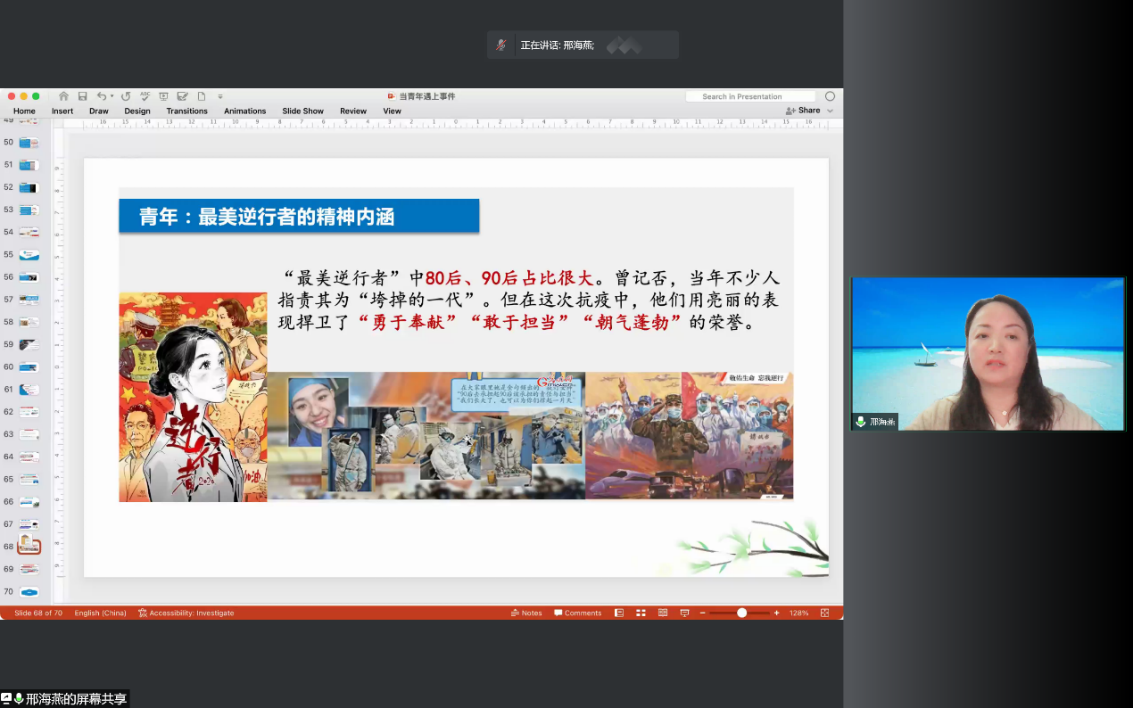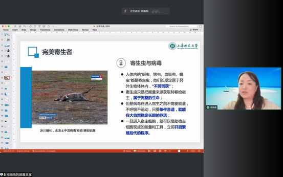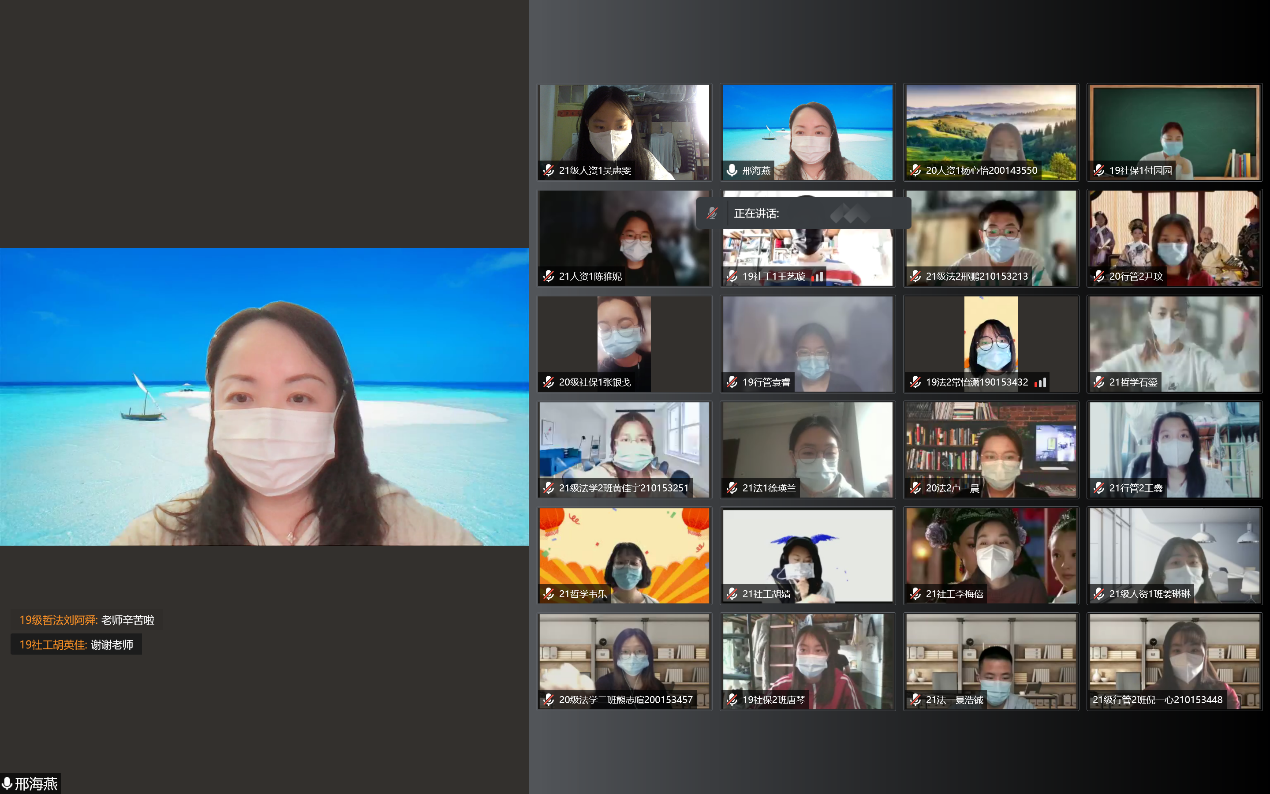 最后,关于“我们应该如何看待病毒”这个问题,邢老师以“天花”的治愈为例,指出人类可能在很遥远的未来战胜新冠病毒,但在当下应该阻止病毒的变异与流行,促进技术的发展,保护环境,坚守人类命运共同体理念,与全球人民携手抗“疫”。她表示同学们作为新时代新青年,应该勇于承担责任,在疫情中展示独属于青年的朝气和风采。