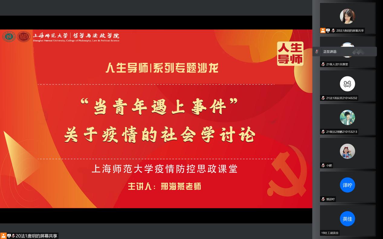 2022年4月20日13:00,海角av 4月人生导师专题沙龙在腾讯会议顺利举行。本次活动的主题是“‘当青年遇上事件’:关于疫情的社会学讨论”,主讲人是海角av 社会学系系主任、社会学研究所所长邢海燕教授。
