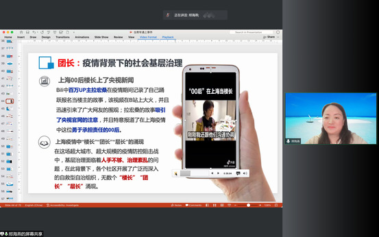 紧接着,邢老师谈到了本次讲座的重点——社会学视角下的疫情现象透视。她为同学们介绍了“集体行为理论”,以“上海外滩踩踏事件”为例进一步解释了非理性集体行为的后果,并结合现实中的“口罩抢购”行动对疫情现象进行了深入的社会学视角诠释。她指出,新冠病毒作为全新的病毒,人类对其缺乏认知且受到环境条件的限制,公共卫生压力大、大众易产生焦虑与恐慌。此外,邢老师还从社会学的角度为同学们介绍了“模仿理论”、“口红效应”和“指甲油效应”等疫情期间的社会消费心理,同时也提到了上海疫情爆发后的“污名化”现象和基层社会治理现状,并分析了社区共同体的回归,“团长”等现象的产生,她提示同学们要客观看待疫情,理性发声,同时也要团结身边亲人、朋友一起抗“疫”。