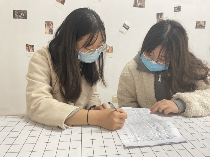 刘姝含老师核对楼宇学生抗原自测结果