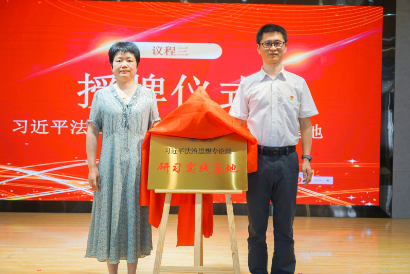 海湾旅游区平安建设办公室党支部书记褚卫红和海角av 党委副书记副院长姚秋磊共同为“习近平法治思想专论课研习实践基地”揭牌。