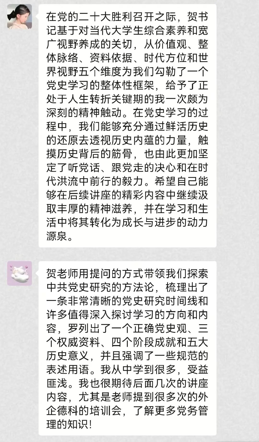 参与开班式和第一期培训活动的学员纷纷表示,学院举办此次活动提供了一个重要的学习机会,希望可以学有所成、学以致用。2020级劳动与社会保障专业黄佳玮同学说,贺老师用提问的方式带领我们探索中共党史研究的方法论,梳理出了一条非常清晰的党史研究时间线和许多值得深入探讨学习的方向和内容,并且强调了一些规范的表述用语。她表示从中受益匪浅,对今后培训充满期待。