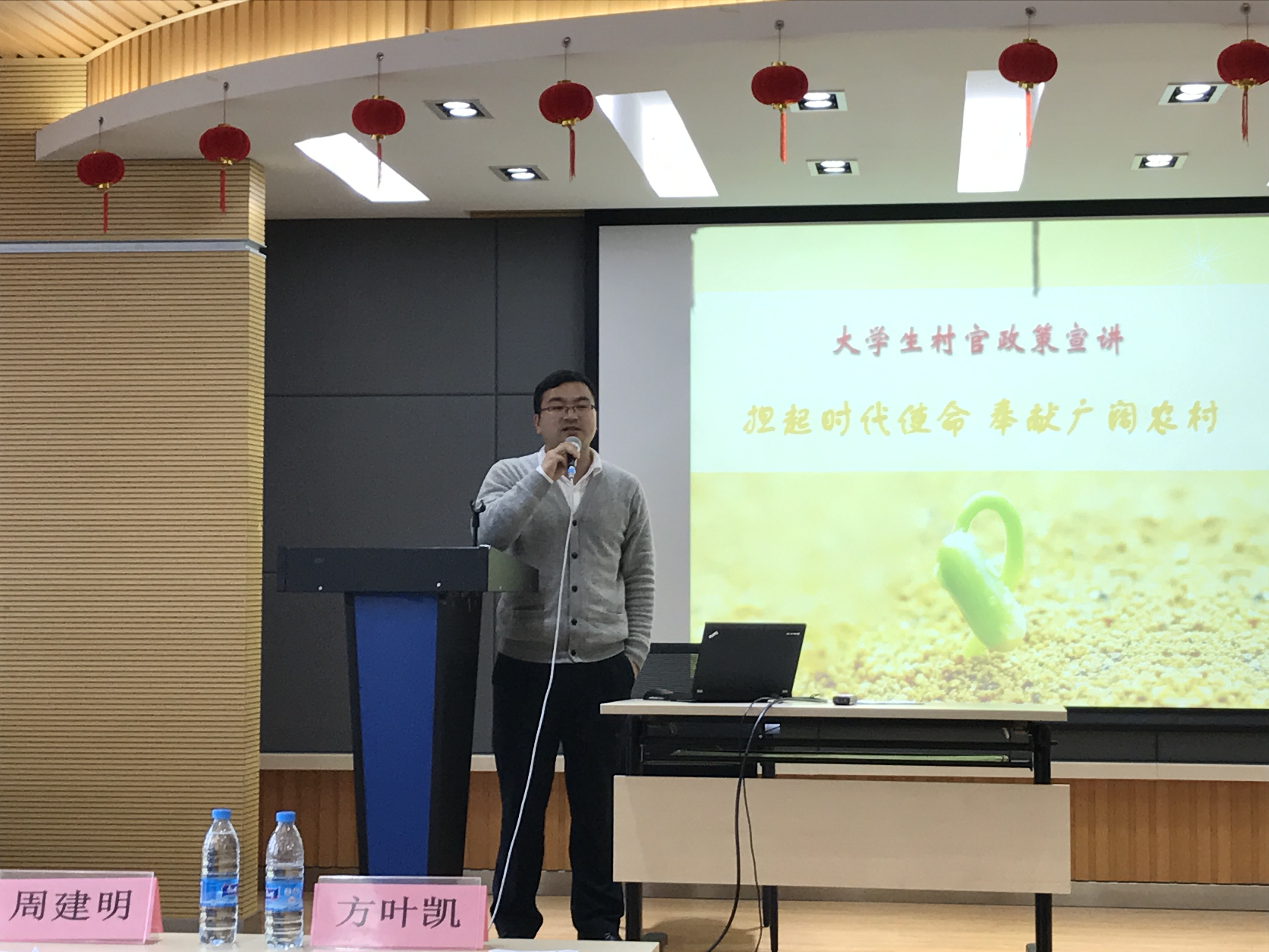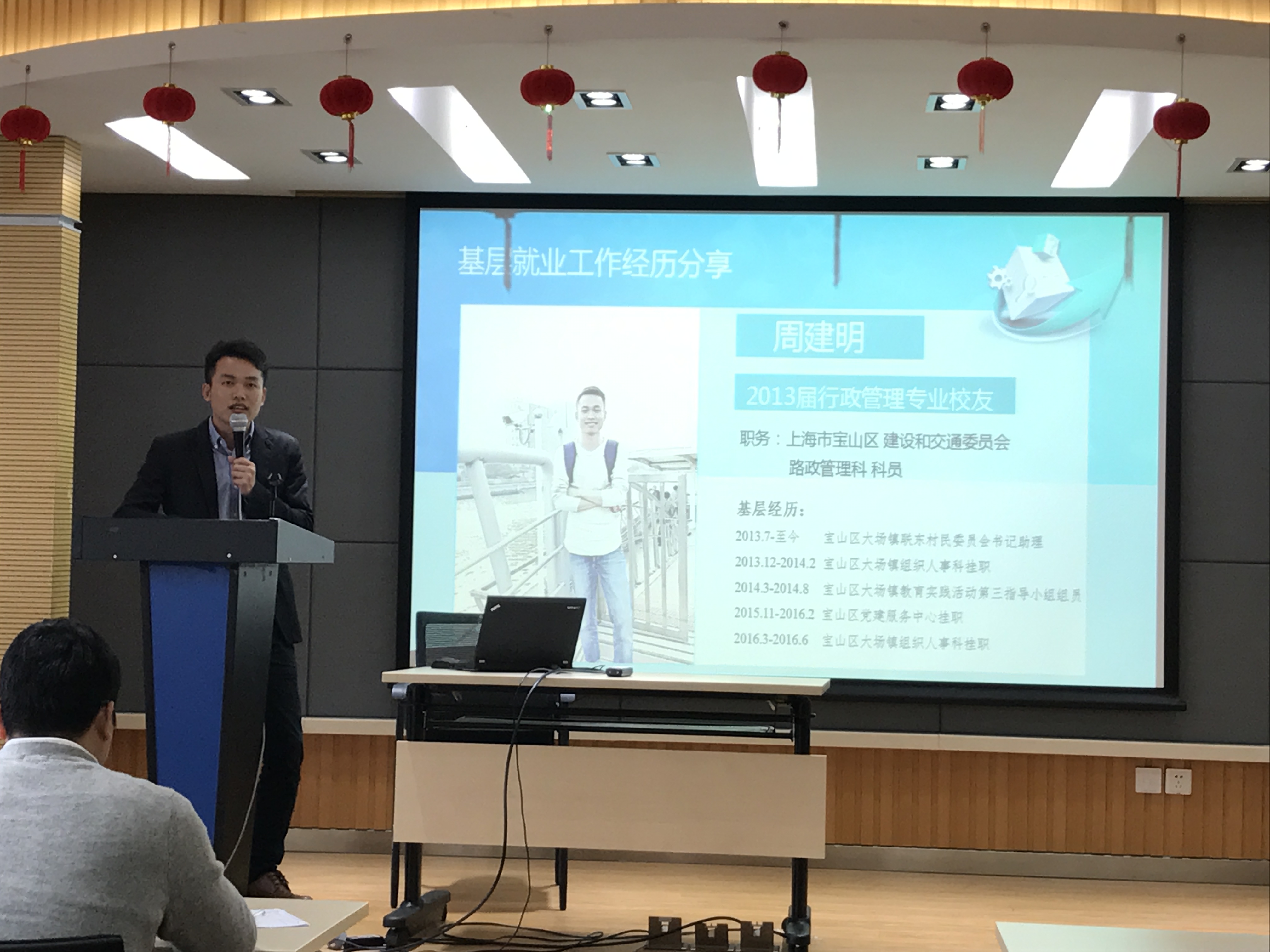 接下来是周建明校友主讲的基层就业工作经历。周建明校友曾在2014至2015年度获得过宝山区优秀大学生村官,同样也有着丰富的基层工作经验。周建明校友首先讲述了自己基层工作的历程:2013年毕业后通过考试,于7月担任宝山区大场镇联东村民委员会书记助理。3年服务期满后参加上海市公务员考试,现任上海市宝山区建设和交通委员会路政管理科科员。其次还介绍了其在宝山区的一些特色工作,如“八个一管理制度”、成立村“班委会”、开办大学生村官报纸等。最后,周建明校友还分享了自己在基层工作的一些经验和心得,告诉即将走向工作岗位的学弟学妹们,要积极融入当地的工作环境中,并且在工作中保持及时的沟通和反馈。