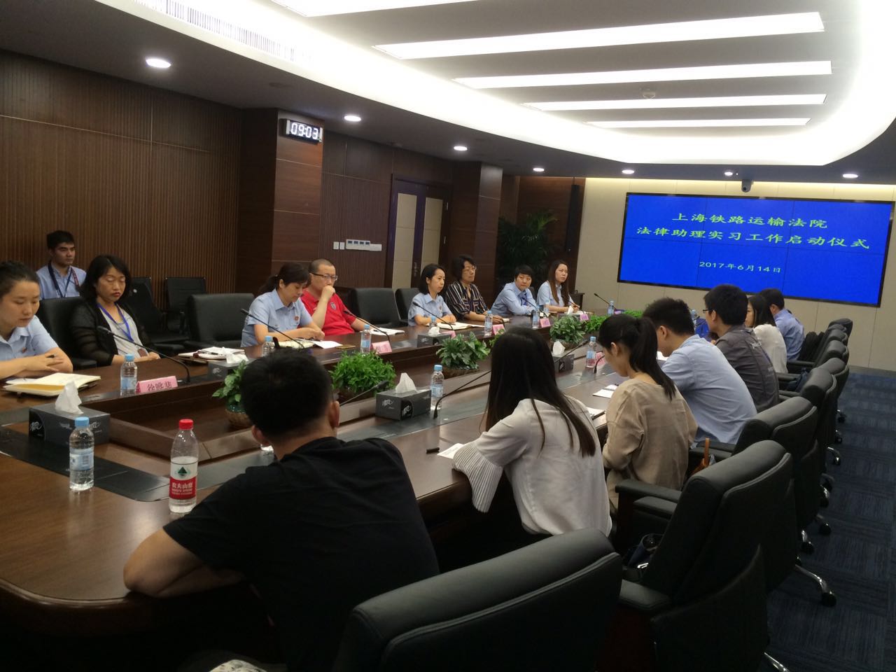 2017年6月14日,海角av 海角av 法律硕士研究生赴上海铁路运输法院(以下简称“上铁法院”)开始了为期三个月的毕业实习,其工作任务是担任法律助理。上午8点45分,上铁法院以及参加此次毕业实习项目的研究生们在一号楼4楼党组会议室举行了法律助理实习工作启动仪式,参加仪式的有上铁法院政治部副主任陈雷、海角av 海角av 法律硕士中心主任环建芬老师、上铁法院部分业务庭庭长和资深法官。会议由陈雷副主任主持。