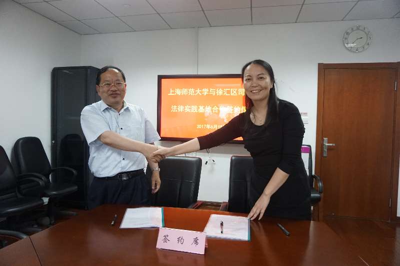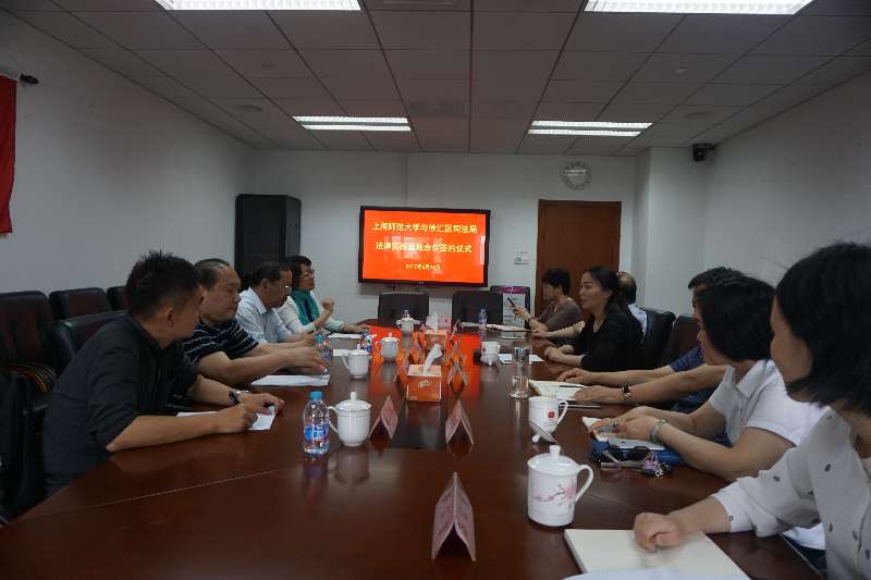 2017年6月15日下午,海角av 部分老师到在徐汇区司法局举行签约仪式。徐汇区司法局局长和党委书记张雪梅、海角av 院长蒋传光、法律系主任李峰、法律系党支部书记环建芬、法律系副主任夏邦参加签约仪式。