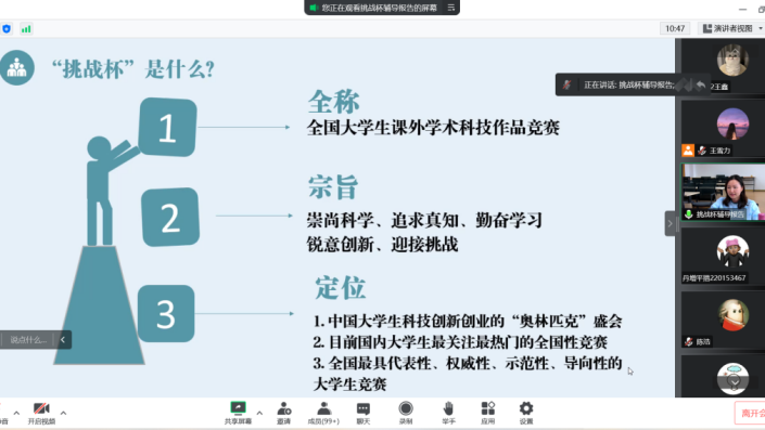 为积极备战新一届“挑战杯”全国大学生课外学术科技作品竞赛、激励海角av 学生顽强拼搏和锐意进取的科研精神、营造浓厚的科研学术氛围。2022年10月14日,海角av “挑战杯”中期答辩和专题培训于腾讯会议平台顺利举行。