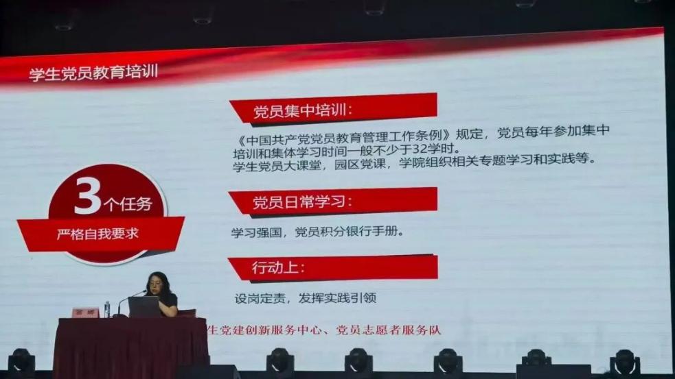 翁娜老师介绍了学院研究生党员新生编入支部情况,重点对党的组织生活、党员组织关系转接、接续培养、发展党员流程等党建工作进行说明,鼓励党员新生积极参与组织生活,完成学生党员教育培训3个任务,严格自我要求,发挥先锋模范作用。