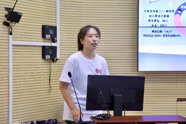 姚秋磊面向研究生新生介绍了学院学生工作总体概况:学院学生工作以党建为引领,成立了党员导师工作室,组建了习近平法治思想和习近平外交思想两大学生理论宣讲团,打造了“灋小宣”普法志愿者、“微光”社工志愿者、“慧眼”反诈志愿者三支志愿者服务队,开拓了政府机关、企业、社区、学校四类实践育人基地,依托法学社、国学社、模拟政协协会、社工协会和人资协会等五大专业社团,举办思政育人、学术科创、法治文化等六大品牌活动。学院的高质量学生工作将为新生提供多元化的实践与成长平台。