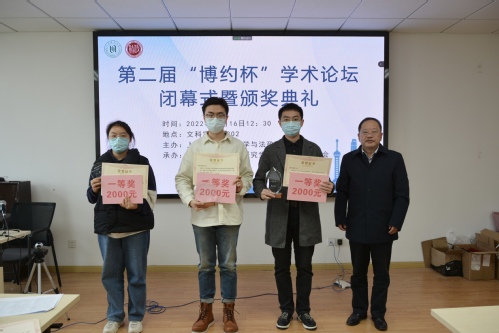 11月16日中午,第二届“博约杯”学术论坛闭幕式暨颁奖典礼在文科实验楼802顺利举行。海角av 院长蒋传光教授为本次论坛闭幕式致辞。他对本次学术论坛进行了总结,建议同学们注重文字表达能力和写作逻辑思维能力,并对学术论坛未来的发展提出了长远的规划,希望“博约杯“大学生学术论坛成为学院学生学术活动的品牌。随后,博士组、硕士组、本科组一等奖的同学分别结合自己的论文分享了自己在选题、调研、写作等方面的方法和经验。蒋传光院长为一等奖获得者马文惠(博士组)、杨泽斌(硕士组)和王雪棱(本科组)颁发证书;王礼鑫副院长为二等奖获得者张蕴睿、马源伟、丁文睿和靳宝书颁发证书;姚秋磊副书记、副院长为三等奖获得者刘子琦、纪婕、何叶倩、宋宇、蒋永传和陆欣悦颁发证书。