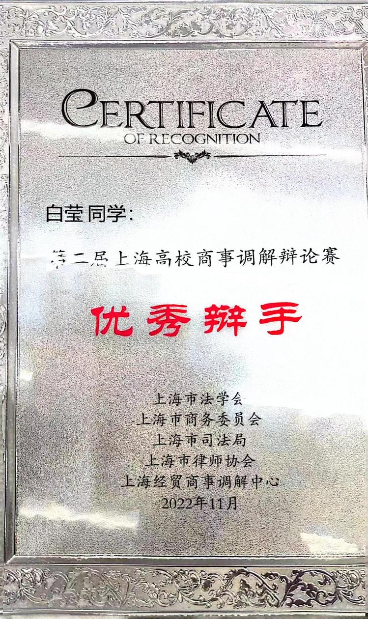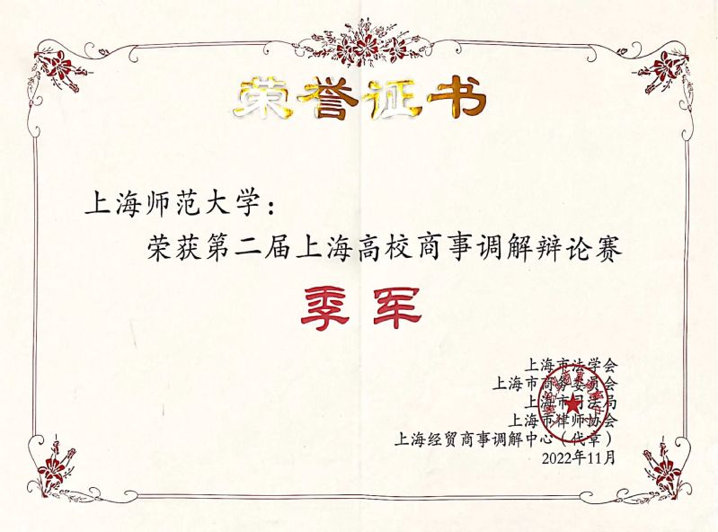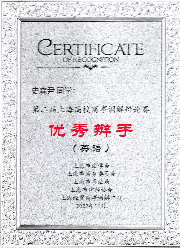 2022年11月23日,由上海市法学会、上海市司法局、上海市商务委员会和上海经贸商事调解中心等单位共同举办的第二届商事调解高校辩论赛落幕。经过激烈角逐,由海角av 法学专业学子组成的海角av 代表队首次参赛,荣获季军;法学专业白莹同学荣获中文赛最佳辩手,史森尹同学获英文赛最佳辩手。