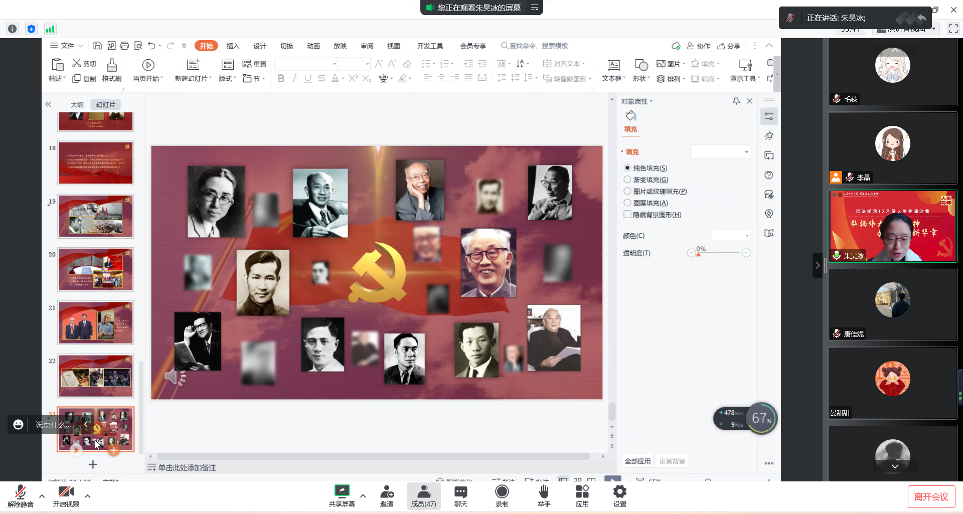 随后,朱老师以中国钢琴的百年发展历史为主线,穿插和展示了《游击队之歌》、《义勇军进行曲》、《红旗颂》、《长征交响曲》等经典红色音乐作品以及背后蕴藏的动人故事、家国情怀,串起了中国共产党惊天动地的发展奇迹。