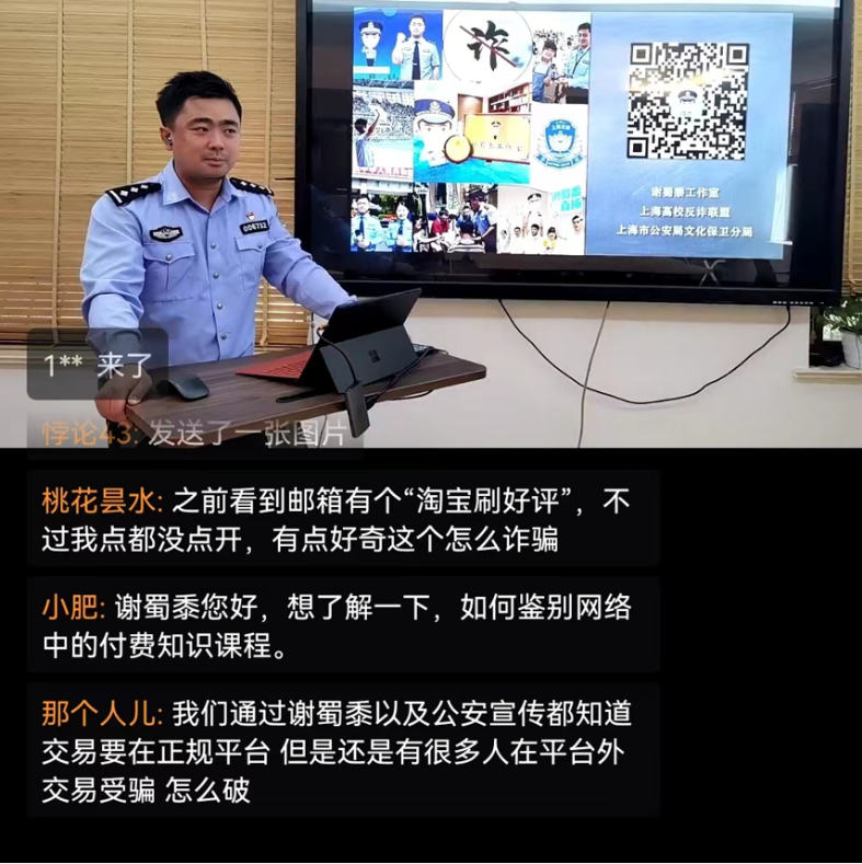 为提升海角av 学生反诈骗意识,提高对骗局的警惕性,增强对反诈套路的识别,2022年5月11日13:00,海角av 特邀上海市公安局文化保卫局治安大队网红警官“谢蜀黍”谢晔围绕高校高发的诈骗手法,为大家带来一堂生动的防骗必修课。全校300余名师生共同参与了本次活动。