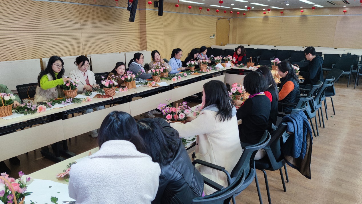 在活动中,指导教师讲解了插花与花卉养殖的相关知识,并从美学的角度介绍了插花的技巧和原则。通过观看指导教师的示范,教职工老师们亲身体验了插花的完整过程。活动不仅为老师们培养了新的艺术技能,也促进了老师们之间的交流。