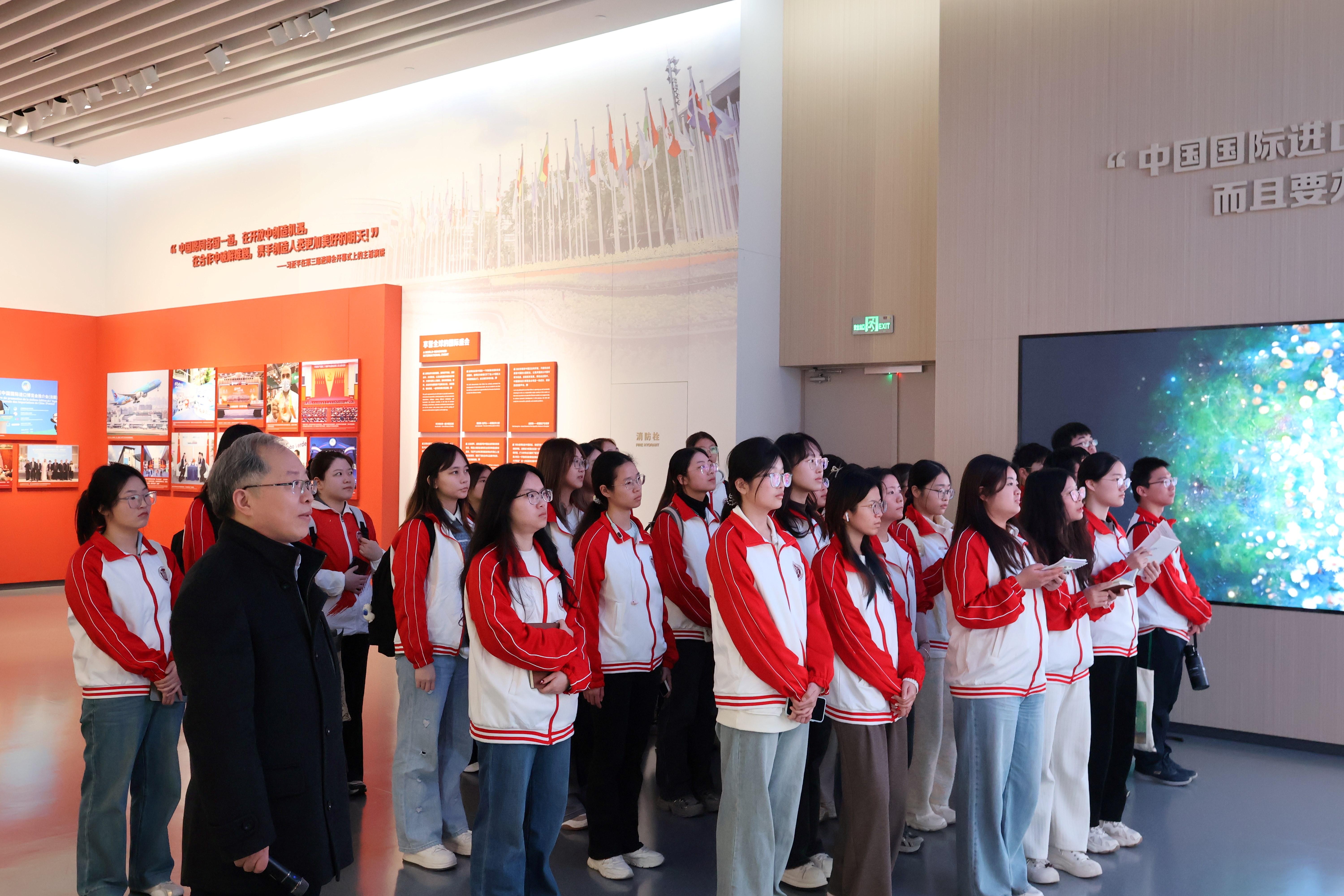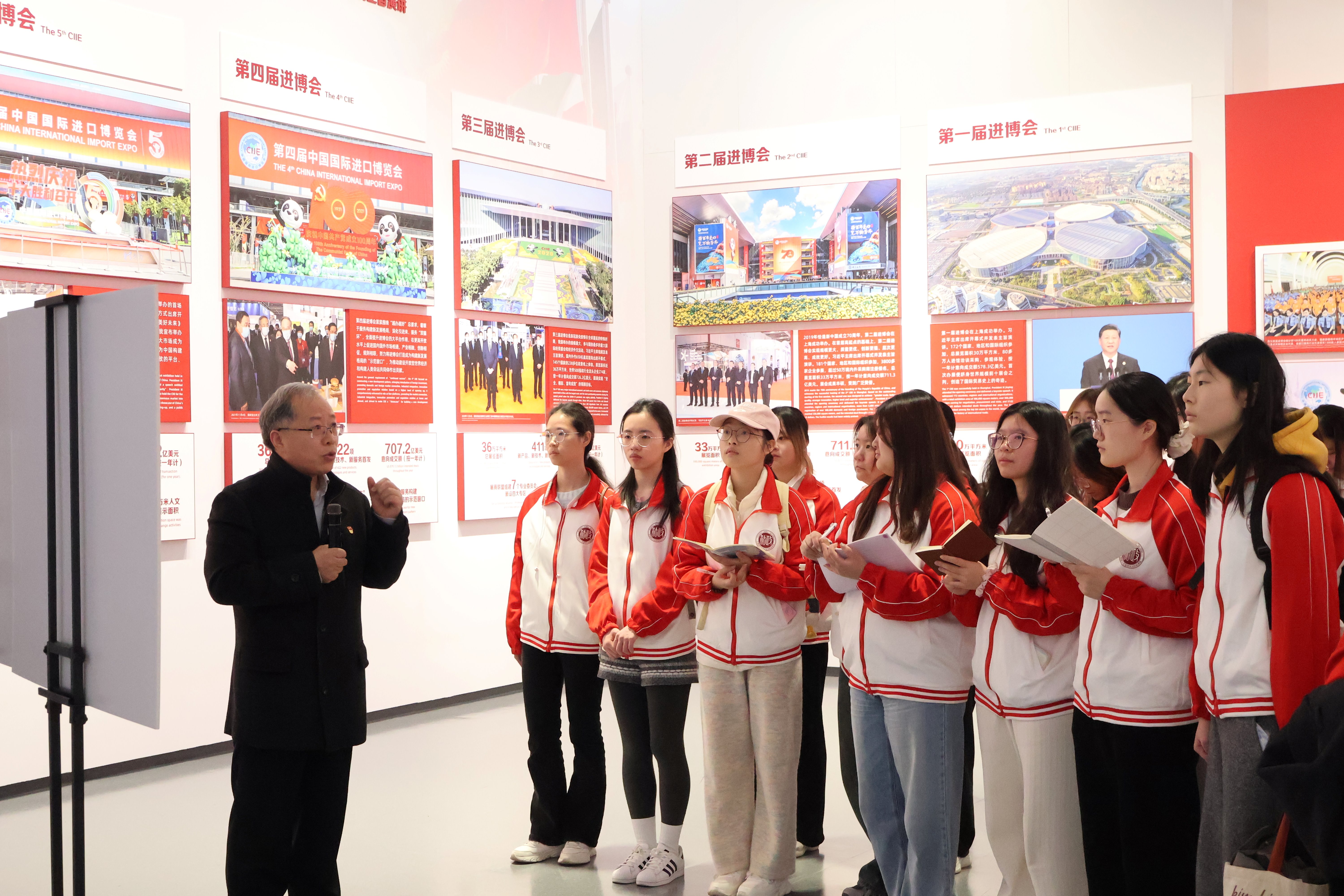 党的二十届四中全会提出,扩大高水平对外开放,开创合作共赢新局面。多年来,进博会已成为中国与世界各国共享机遇、共同发展的重要平台。活动伊始,学院党委副书记、副院长姚秋磊回顾了学院此前举办的系列情景思政课程,强调追寻总书记的足迹,既是一次思想洗礼,更是一次实践历练;他勉励同学们在情景课堂中用心观察、深入思考,从进博文化展示中心这一开放窗口,学习感悟中国与世界同频共振的时代脉搏。