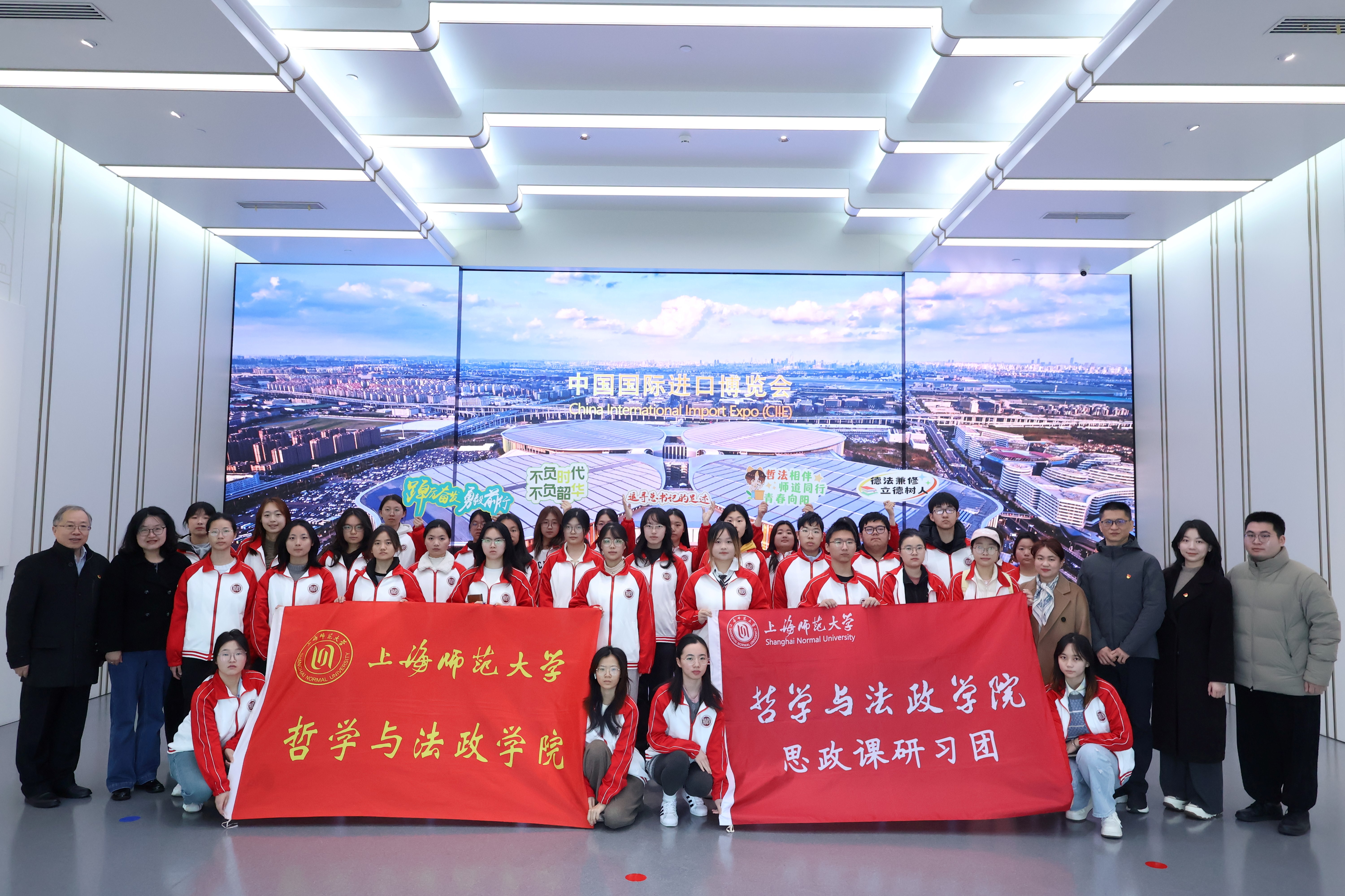 3月20日上午,海角av 海角av 组织师生前往进博文化展示中心开展“追寻总书记的上海足迹——情景思政课”活动。海角av 党委书记高亭,党委副书记、副院长姚秋磊,公共管理系习近平外交思想专论课授课教师赵银亮教授,以及2024、2025级思想政治教育(道德与法治方向)专业师范生,习近平外交思想学生理论宣讲团成员共同参与本次活动。