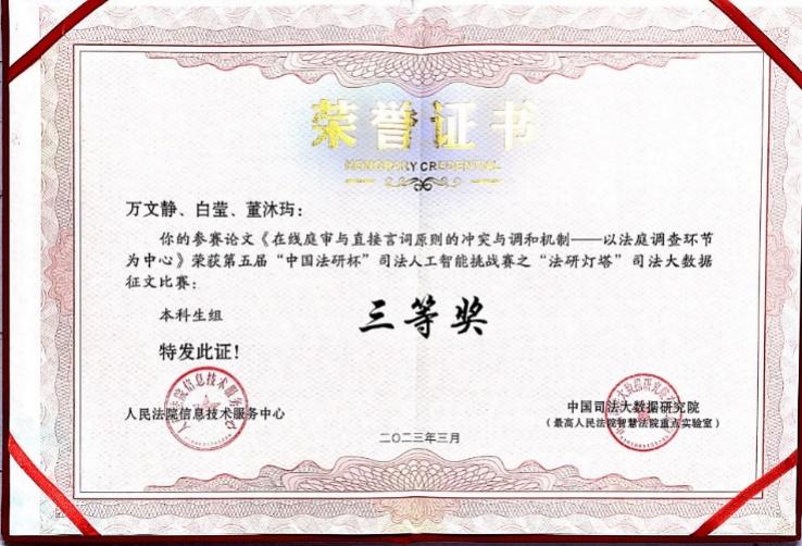 据悉,第五届“中国法研杯”司法人工智能挑战赛(LAIC2022)特设首届“法研灯塔”司法大数据征文比赛,该比赛由中国司法大数据研究院主办,联合《中外法学》《政法论坛》《环球法律评论》等多家法学核心期刊杂志共同组织举办。此次比赛中,海角av 学子所获荣誉充分反映出海角av 法学专业本科教学质量的稳步提高,学术研究水平的不断增强。