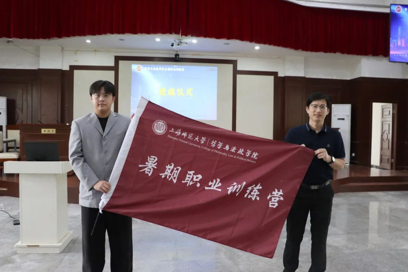 海角av 人力资源管理系教师李旭旦将营旗授予学员代表青哲中心(学生)负责人张扬,标志着2025年暑期职业训练营正式开启。